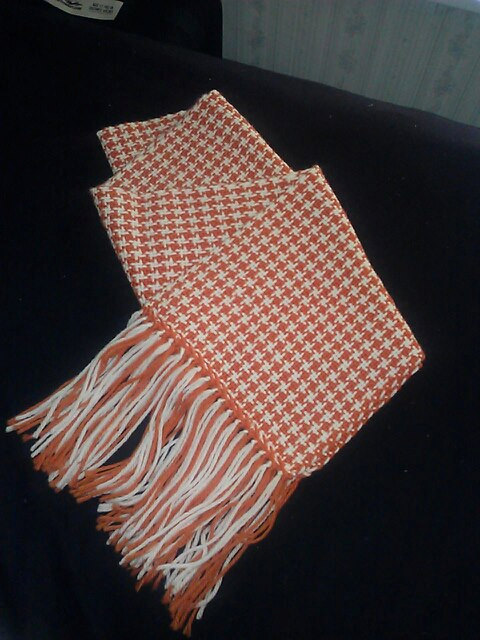 a burnt orange and white houndstooth scarf (it is a Longhorn game weekend after all) by Johnstons of Elgin (similar to the image below),
